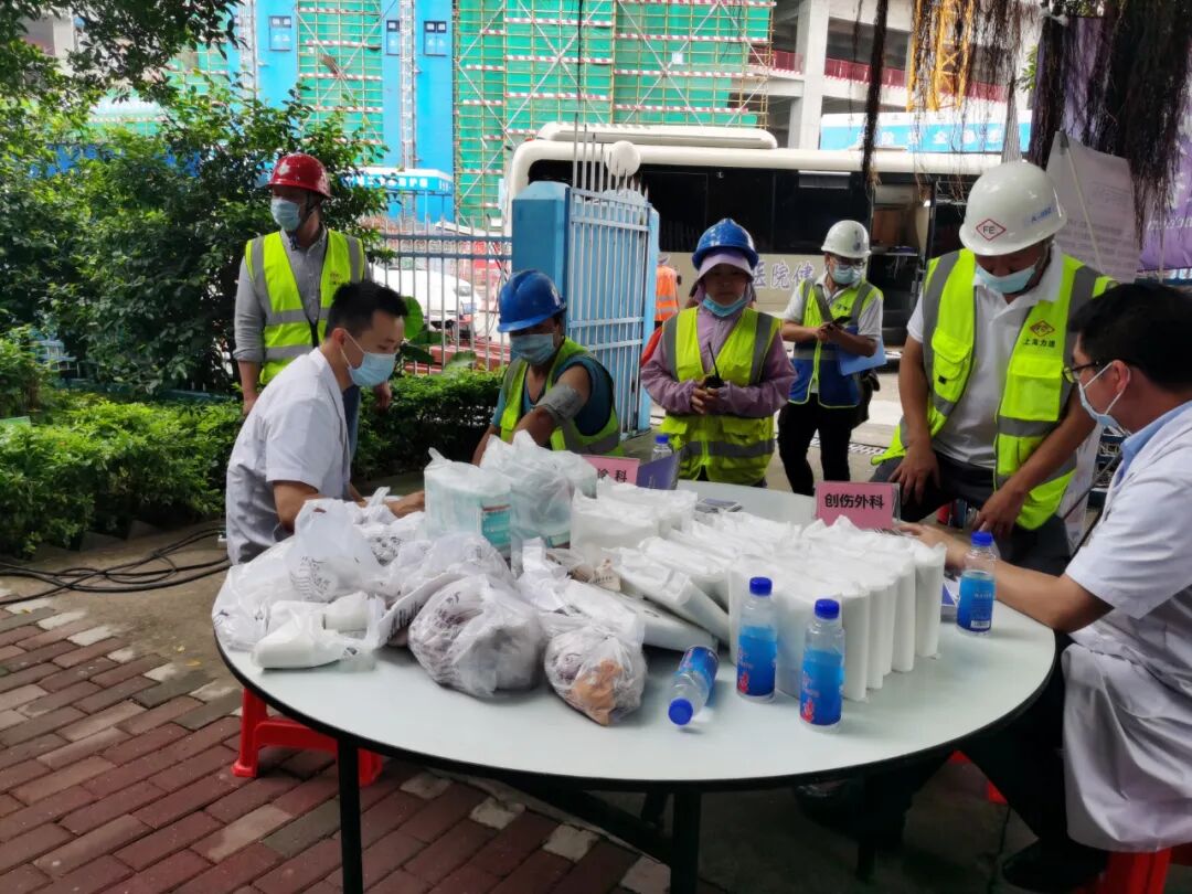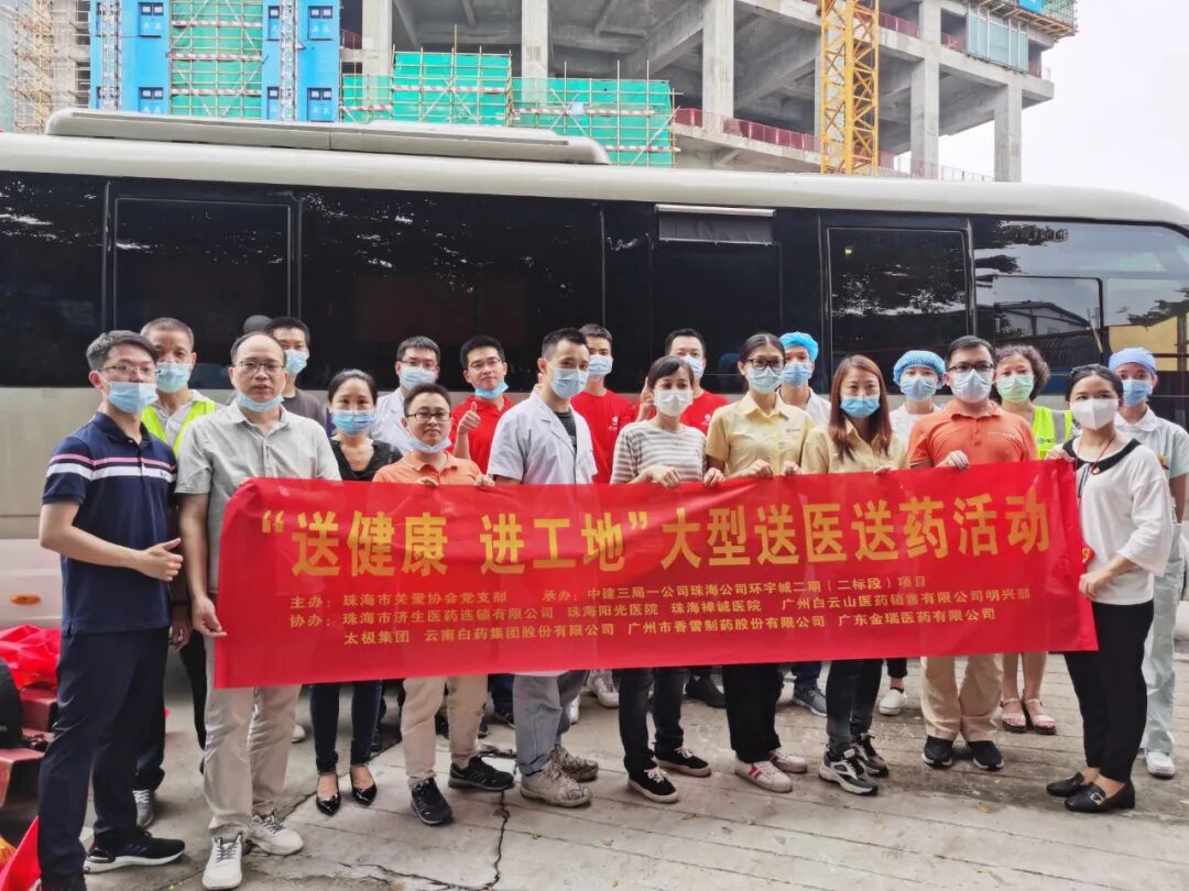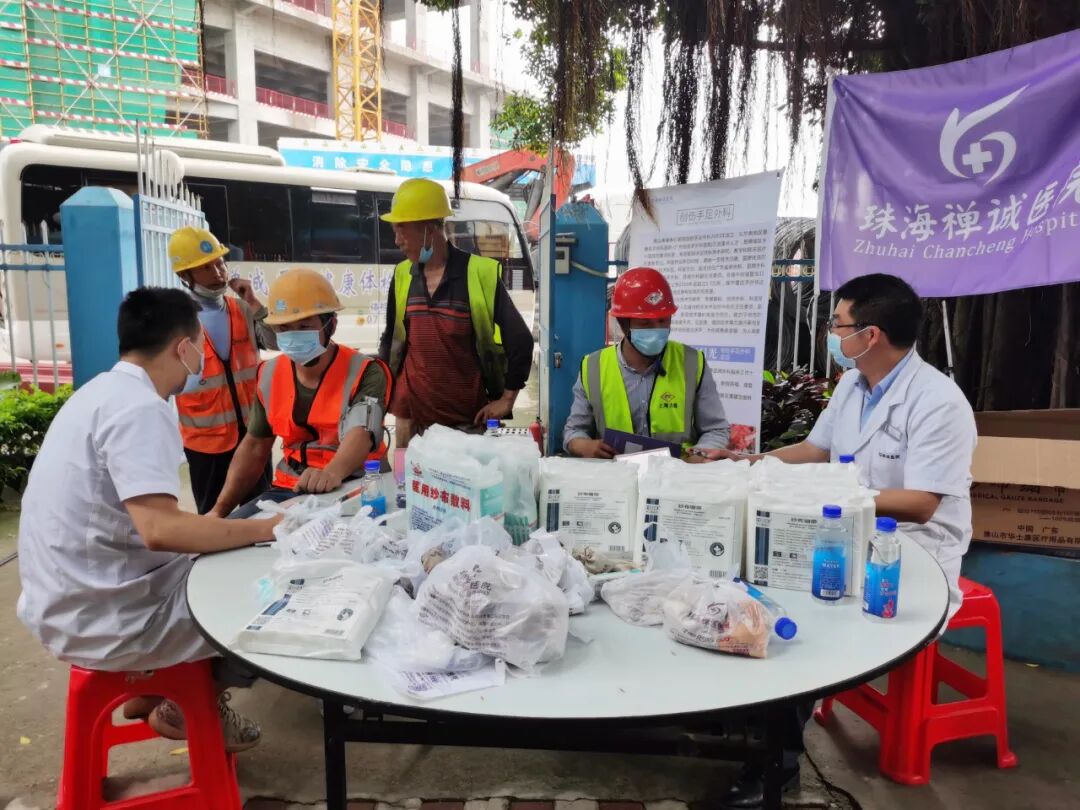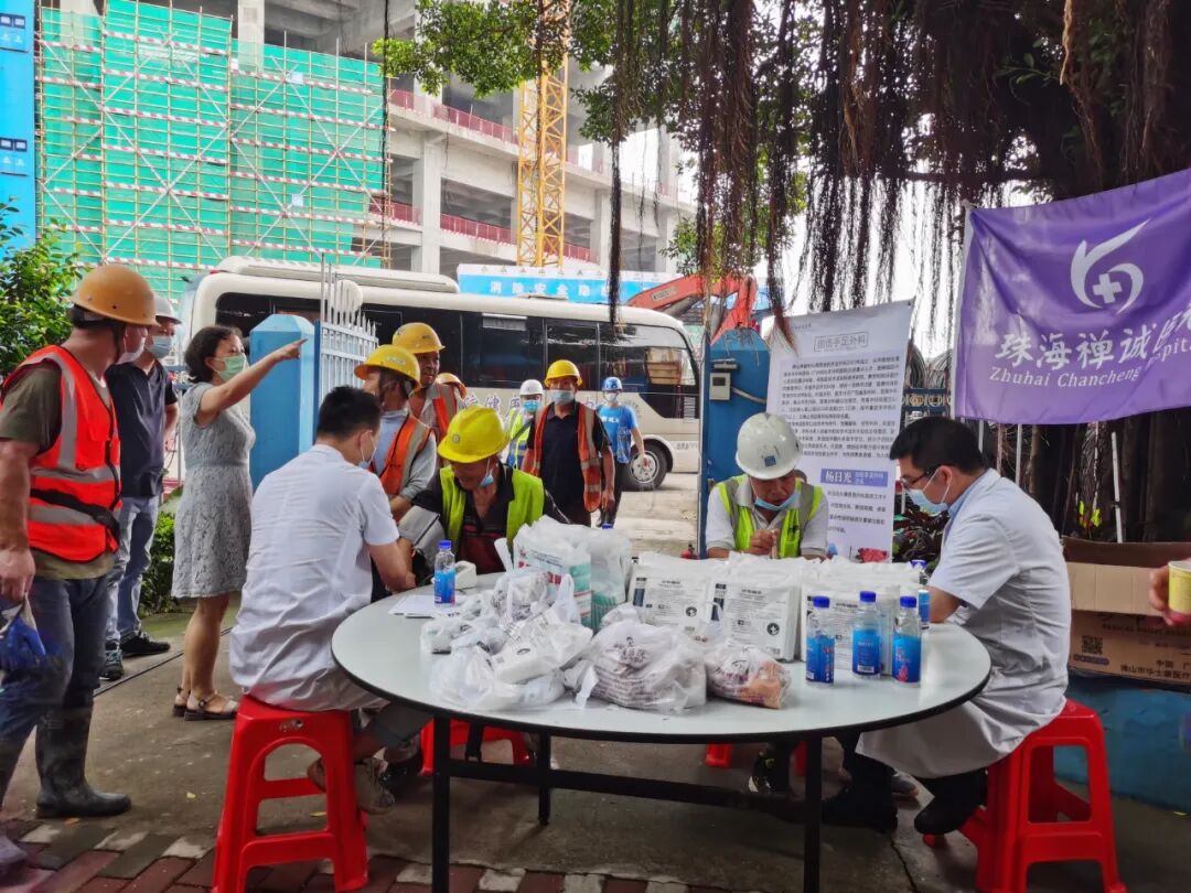 5月27日,珠海市关爱协会党支部组织珠海禅诚医院等爱心企业医护人员走进中建三局——珠海公司环宇城建筑工地。开展以“ 送健康,进工地”为主题的大型送医送药义诊活动,我院体贴入微的服务,受到工友们的一致好评。