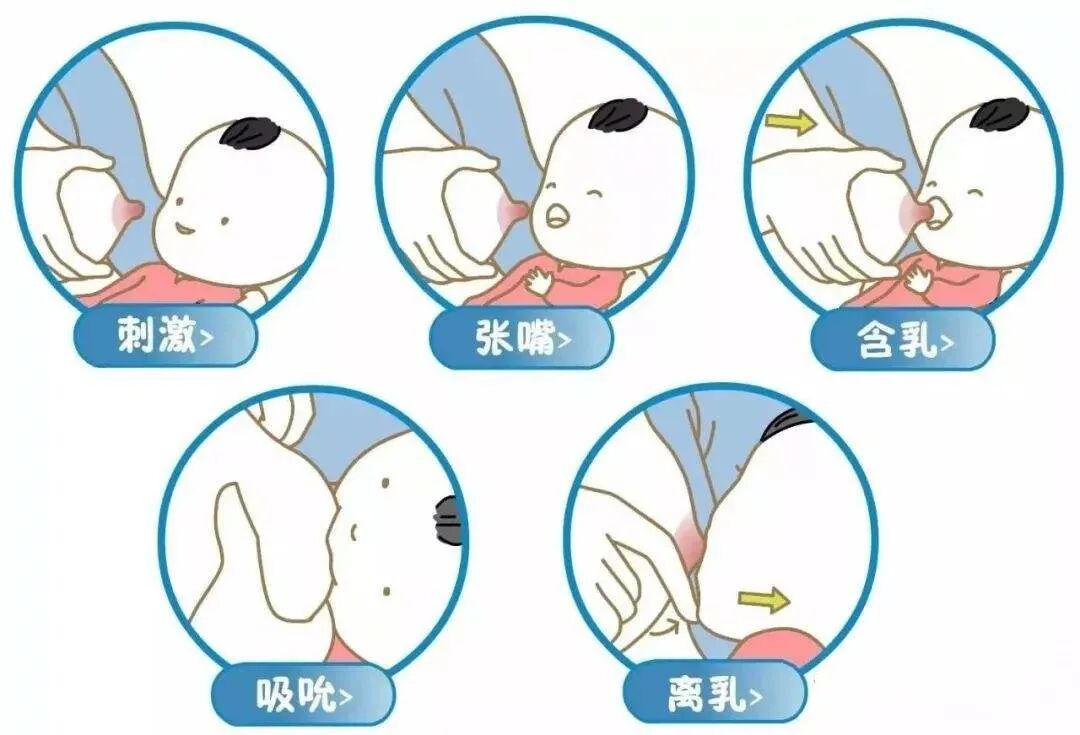 四:待宝宝开始用力吮吸后,应将宝宝的小嘴轻轻往外拉约5mm,目的是将乳腺管拉直,有利于顺利哺乳。