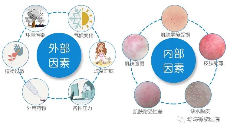 皮肤过敏,往往是因为皮肤不能够在短时间内适应环境的温度,从而使得肌肤过敏。另外还有粉尘、花粉、动物皮毛季节变化、日光、寒风等条件因素都有可能诱发皮肤过敏。